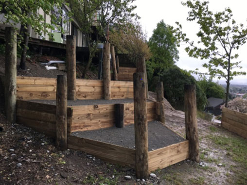 • Construction on new intermediate pole retaining wall above one by the road, including steps for changes in ground height